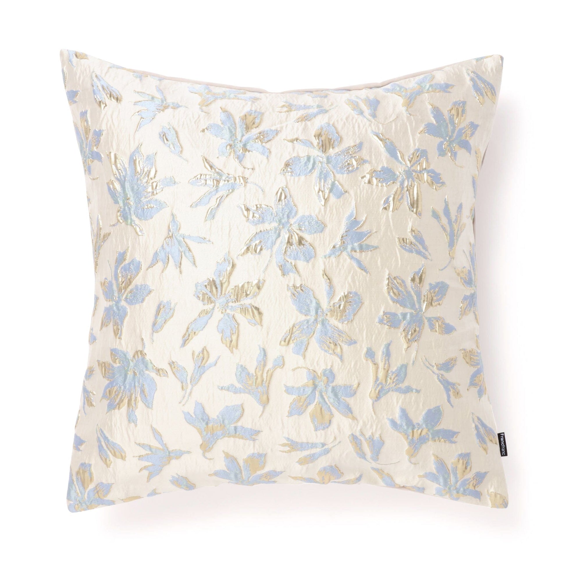 It is a cushion cover that expresses a floral pattern with a jacquard weave using metallic thread.An elegant design with an overall gentle and cool color scheme accented with gold.