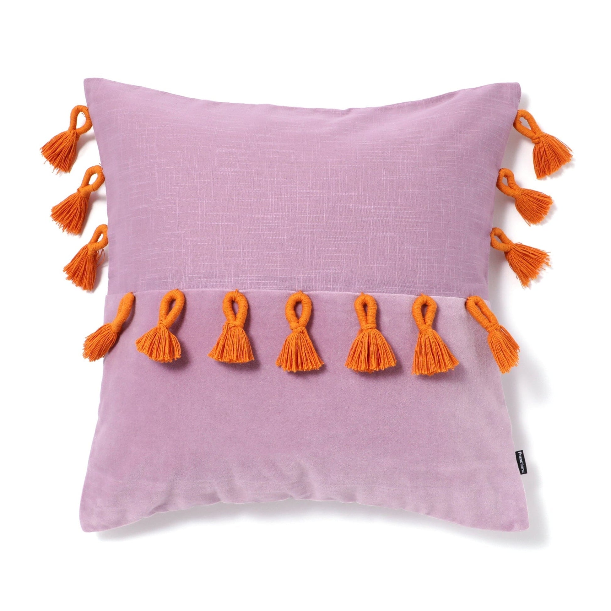 A cushion cover with bold tassels.The key point is that the top and bottom are made of slub fabric and velvet fabric.